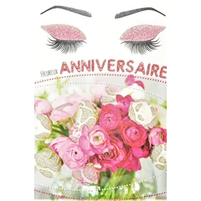 Happy Birthday Card with Sequins Woman Scent a Bouquet of Pink and White Flowers Make Up Mascara Made in France
