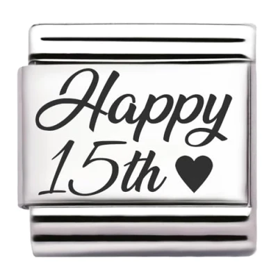Happy Birthday Engraved Italian Charm 9 mm Stainless Steel Link Fits All Modular Stretch Bracelets Jewellery Gift Idea for Birthday, Jubilee or Year Number (Happy 15th)
