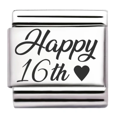 Happy Birthday Engraved Italian Charm 9 mm Stainless Steel Link Fits All Modular Stretch Bracelets Jewellery Gift Idea for Birthday, Jubilee or Year Number (Happy 16th)