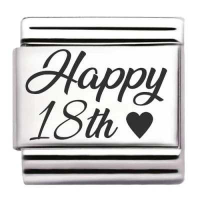 Happy Birthday Engraved Italian Charm 9 mm Stainless Steel Link Fits All Modular Stretch Bracelets Jewellery Gift Idea for Birthday, Jubilee or Year Number (Happy 18th)