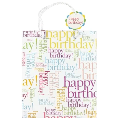 Present that special birthday gift in style! Premium quality gift bag features a repeated ''Happy Birthday!'' message in multiple colors. Premium quality gift bag features a repeated ''Happy Birthday!'' message in multiple colors. Design is embellished with eye-catching gloss highlights. The finishing touches: White metal grommets, white cord handles, and an attached matching circular ''To/From'' card. Substantially constructed gift bag is side-pleated and has a reinforced cuff and a flat bottom with a cardboard insert. Gift bag measures 8-1/2'' wide x 10'' high by 3-7/8'' deep when open.