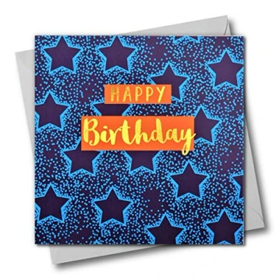 Happy Birthday Greeting Card, Blue Stars, Text Foiled in Shiny Gold, Open, for Him, Her, Friend, Mum, Dad, Son, Sister, Brother