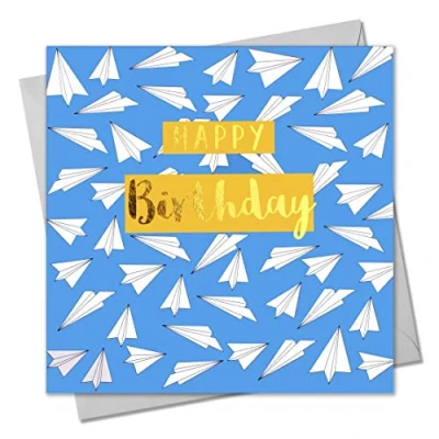 Happy Birthday Greeting Card, Paper Planes, Text Foiled in Shiny Gold, Open, for Him, Her, Friend, Mum, Dad, Son, Sister, Brother