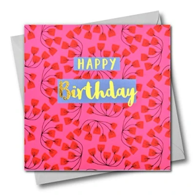 DIMENSIONS: 150x150mm CAPTION: Happy Birthday EMBELLISHMENT: Foil detail with Shiny Gold BLANK INSIDE: Space inside for your own message MADE IN THE UK: Designed, printed and finished in the UK HIGH-QUALITY: Printed on top quality heavy 350gsm card stock, with envelope included SUSTAINABLE: Comes wrapped in Compostable bag or with a card catch label. Both the greetings card & envelope are sustainably sourced and recyclable STANDARD LETTER SIZE: Can be sent with Royal Mail standard letter stamps