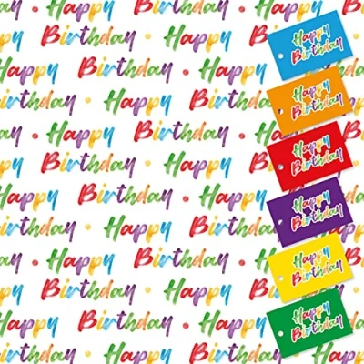 Happy Birthday Wrapping Paper. 5 XL Sheets (50 x 70cm). Gift Wrap with Matching Tags. Cutting Grid on Reverse.