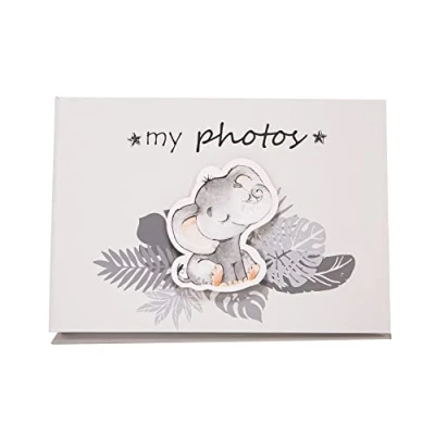 Beautifully designed dove grey baby photo album, perfect for a baby boy or girl. Decorated with a cute 3D baby elephant with dark and light grey palm leaves and floral decoration behind. Features wording "my photos" in silver foil with matching silver plated decorative stars either side. This wonderful picture album makes for a perfect baby shower or new born baby gift. The album holds 24 pictures of 4" x 6" size. The elephant themed front lining pages are beautifully decorated with spaces to enter the "to" and "from" information. The actual album measures: 5 "in height , 7" in width and 1.5" in depth.