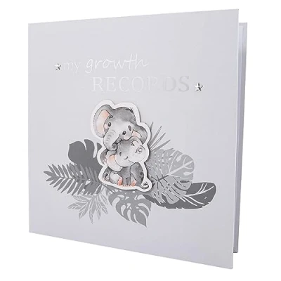 Fun and quirky baby elephant themed 32-page growth records book - makes for a lovely baby shower or new born baby gift idea. Finished in a light dove grey unisex colour with raised shiny silver stars, light and dark grey palm leaves and silver foil text "my growth records". Features 32 pages for you to personalise including physical information, the first time you laughed, crawled etc. First birthday information, small envelope for first hair cut, a place for tiny handprints. There are several pages for pictures with a space to add the date and any other information. There is a dedicated page to add the pregnancy information, another the first adventure and another for baby's first Christmas.