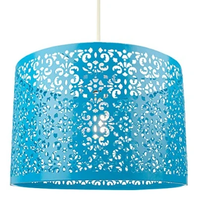 Moroccan style metal non-electrical circular pendant shade with intricate laser-cut decoration creating a stunning light effect against the wall. Finished in matt teal and available in several other colours. The product dimensions are: Height - 19cm, Depth - 29cm, Width - 29cm. Maximum wattage allowed is 60w. Please note that ceiling rose and cable is not included - pendant shade only being sold. Complete with shade reducer ring allowing for most lamp bases - B22/BC, E14/SES and E27/ES. Light bulb not included., Weight: 1.984160358 Pounds, Manufacturer: Happy Homewares