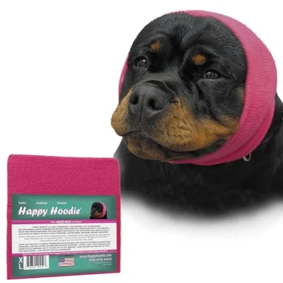 MADE FOR GROOMERS, BY GROOMERS. Happy Hoodie was created as a grooming tool to CALM & protect dogs from the loud noise & high-pressured air associated w/ force drying. Happy Hoodie saves valuable time in the Grooming Salon & creates a safer environment by calming upset, disagreeable, aggressive, or sensitive dogs during any potentially stressful situation, such as toenail clipping, clipper work, brushing, bathing, etc. The dog anxiety calming aid you want to have in your dog grooming tool kit. HOW TO REDUCE NOISE. It is important to place the ears DOWN over the ear canals so the ear canals are NOT exposed, then secure them in place w/ Happy Hoodie. Noise reduction is achieved by Happy Hoodie’s gentle compression closing off the ear canal. IF YOU THINK IT'S TOO TIGHT, PLEASE KNOW SNUGNESS IS NECESSARY. IF YOUR 4 FINGERS FIT UNDER IT, IT'S NOT TOO TIGHT (IT'S SO STRETCHY!). Pets appreciate it most when used ONLY during a stressful situation. PLEASE REFER TO SIZE GUIDE BEFORE PURCHASE. HELPS KEEP PETS CALM AND COMFORTABLE AT HOME TOO! Uses include: Anti-anxiety aid for stress in the home, car, and at the Vets; dog ear muffs for noise cancelling to protect dogs’ ears and hearing from loud noise, such as Thunder, Fireworks, vacuums, and gun fire; aerate the ears; heal or prevent hematomas; neck and ear warmers; grooming aid; keeping long ear and facial hair up and out of the way while eating or drinking. RECOMMENDED BY VETS to help prevent or heal hematomas when used as a dog ear wrap for shaking heads, help control bleeding; aerate the ears to speed up recovery of an ear infection; keep medication from being shaken out of ears; provide dog ear protection for swimming and bath time; as a post-surgery ear protection aid. A NATURAL, HOMEOPATHIC DOG CALMING REMEDY SINCE 2008, its swaddling effect will soothe and comfort pets. When worn together, Happy Hoodie can increase and complement the efficiency of dog anxiety vests, fireworks and separation anxiety jacket, stress collars, AND calming scarf. It may also be used in conjunction with oral calming remedies.