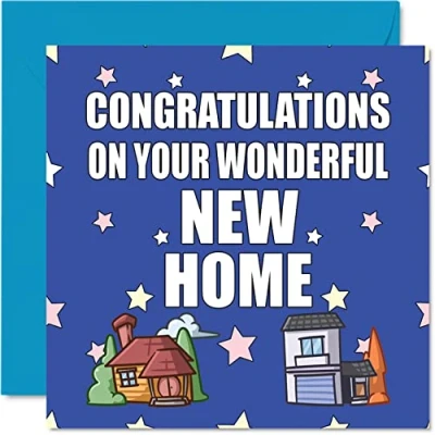MAKE THEM SMILE WITH THIS NEW HOME CARD: This exceptional quality moving home cards for her or him shows the design "Congratulations On Your Wonderful New Home". If you are looking for great Congratulations greetings cards for men or women, then then this welcome home card is bound to make them smile. Not just for a new home cards for couple this could also be for a Friend, Colleague, Brother, Sister, Son, Daughter or Family. WHAT DO YOU GET: The card is printed on one side and BLANK ON THE INSIDE to allow you to write your very own message. The unique fun design is printed on a specially sourced and environmentally responsible board. At 360 microns thick the natural white one-sided gloss board has a quality look and feel. Supplied with a coloured gummed envelope to complement the design and ready to be sealed and sent in the post. NO INK SMUDGES: There is nothing worse than writing inside a card to find that the shiny surface makes the ink smudge. This is why we use a high quality one sided coated board. The uncoated side will absorb more of the ink from your pen to make smudging a thing of the past. Housewarming card. SIZES: Greeting Card = 145mm x 145mm, Envelope = 155mm x 155mm, Card Thickness = 360 micron. Great new home cards UK. Congratulations cards, new home cards for family, new home card for couple, new chapter moving house gifts, welcome to your new home cards prime. MADE AND QUALITY CHECKED IN THE UK: We print and manufacture all our product right her in the UK so you can be sure of a fast turnaround and a product that is expertly made. Using environmentally responsible premium board our card is conscious of the responsible management of the world's forests -