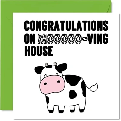 Happy New Home Card Funny Moooo ving House Congratulations Housewarming Cards, Joke Banter Moving 145mm x Welcome Warming Greeting Cards for Friends Family