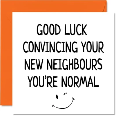 MAKE THEM LAUGH WITH THIS FUNNY NEW HOME CARD: This exceptional quality moving home cards for her or him shows the design "Good Luck Convincing Your New Neighbours You're Normal". If you are looking for funny congratulations greetings cards for men or women, then then this welcome home card is bound to make them laugh. Not just for a new home cards for couple this could also be for a Friend, Colleague, Brother, Sister, Son, Daughter or Family. WHAT DO YOU GET: The card is printed on one side and BLANK ON THE INSIDE to allow you to write your very own message. The unique fun design is printed on a specially sourced and environmentally responsible board. At 360 microns thick the natural white one-sided gloss board has a quality look and feel. Supplied with a coloured gummed envelope to complement the design and ready to be sealed and sent in the post. NO INK SMUDGES: There is nothing worse than writing inside a card to find that the shiny surface makes the ink smudge. This is why we use a high quality one sided coated board. The uncoated side will absorb more of the ink from your pen to make smudging a thing of the past. Housewarming card. SIZES: Greeting Card = 145mm x 145mm, Envelope = 155mm x 155mm, Card Thickness = 360 micron. Great new home cards UK. Congratulations cards, new home cards for family, new home card for couple, new chapter moving house gifts, welcome to your new home cards prime. MADE AND QUALITY CHECKED IN THE UK: We print and manufacture all our product right her in the UK so you can be sure of a fast turnaround and a product that is expertly made. Using environmentally responsible premium board our card is conscious of the responsible management of the world's forests -