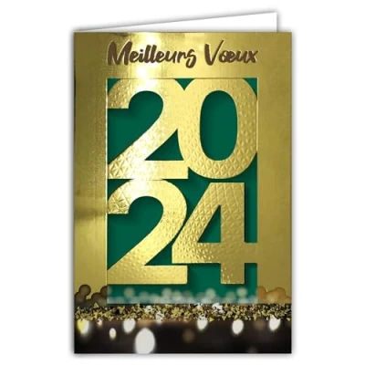 Happy New Year Card 2024 Best Wishes in Shiny Gold Sparkling with White Envelope, Size 12 x 17.5 cm Large Number Flashes of Midnight Made France