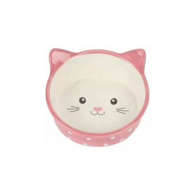 General description This ceramic feeding bowl is purrrfect for your little furry feline friends. Once your cat has licked the dish clean, the outline of a cat face will add a little fun to mealtimes. Technical specifications Material: Ceramic Color: Pink/White Dimensions: 39 x 29.5 x 43 cm Dishwasher safe Usage Suitable for food, water, and treats Ceramic material helps keep the water cool