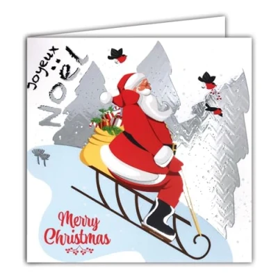 Happy Santa Claus Silver Shiny Square Card with White Envelope 15 x cm Sledge Hood Delivery Gifts Forest Fir Birds Robins 25 December Holidays End of Year Winter Made in France