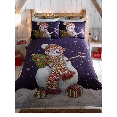 Add a touch of festivity to your bedroom with this Snowman themed design Featuring a cheerful snowman holding a christmas tree and surrounded by presents, printed onto a navy backdrop with white snowflakes taking up the blank spaces, this duvet cover set is more than a perfect way to get anybody into the festive spirit Material: Polycotton (52% Polyester and 48% Cotton) Machine Washable at 40°C Tumble dry