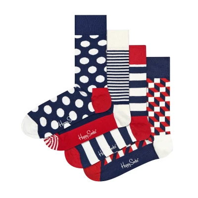 Add a splash of red, white and blue to your sock drawer with these Men’s and Ladies novelty socks with loads of bold and funky patterns. Available in a great gift box, ideal for gift giving.Filled with four pairs of socks in original designs, this matching box features Polka Dot, Thin Stripes, Thick Stripes and Filled Optic styles for a unique and colourful combination. Perfect for jazzing up your feet.The Novelty Happy Socks are made of soft 86% combed cotton for added softness and comfort and feature reinforced heels and toes for extra durability and even more comfort. They're also available in two different sizes so you can find the perfect fit.Happy Socks are a popular brand providing a high-quality sock that combines unique designs and craftsmanship. Mikael Söderlindh and Viktor Tell had a vision to spread happiness by turning an everyday essential into a colourful design piece.Today, Happy Socks has reached 90 countries and every continent. With Concept Stores all around the world, from LA to Tokyo, Happy Socks can be found in over 10,000 top fashion apparel boutiques.These socks are made from 86% Cotton, 12% Polyamide, 2% Elastane and come in 2 sizes: Men’s 6-11 UK & Ladies 4-7 UK. They come in 4 great patterns and they are Machine Washable.Extra Product DetailsHappy Socks Adult Novelty SocksSoft Combed Cotton4 Pairs Per PackReinforced Heel & Toe4 Bold & Funky PatternsRed, White & Navy ColoursA Perfect Gift IdeaSoft & ComfortableComes In Gift BoxHappy Socks Branded2 Size OptionsMachine Washable