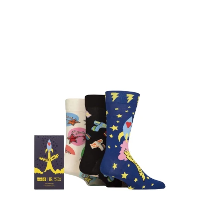 Elton John may be retiring from the live stage but his legend absolutely continues on with this three-pair set of Happy Socks Elton John Gift Boxed Socks! Each pair of these officially licensed, cotton rich socks has an instantly-recognisable aspect of Elton’s decades-spanning image, with elaborate glasses and platform boots motifs, plus a pair dedicated to one of his most enduring 70s hits, “Rocket Man”. The three pairs of unisex styled socks come in a colourful, deluxe gift box. Every pair is made from a high quality, soft and breathable combed cotton blend, crafted in a crew length, with flat, smooth toe seams and with added reinforcement for the heels and toes. You’ll be proud to tell everybody, that these are your socks!