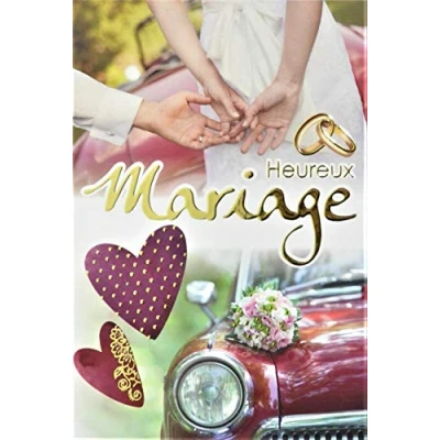 Happy Wedding Card with Gold Plated Rings Hand Wearing Car Red Burgundy Hearts Bouquet Flowers Made in France