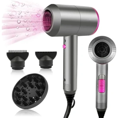 Powerful Styling Performance - Our hair dryer features a robust AC motor, ensuring fast and efficient drying with powerful airflow. Say goodbye to waiting around for your hair to dry and hello to quicker styling sessions Versatile Styling Attachments - Equipped with two concentrator nozzles and a diffuser, this hair dryer offers versatility to cater to various hairstyles. Whether you're aiming for sleek straight locks or voluminous curls, our attachments have you covered Advanced Hair Care Technology - Experience salon-quality results at home with our hair dryer's advanced features. Constant temperature technology ensures even drying without causing damage, while the built-in ionization function leaves your hair smooth, frizz-free, and irresistibly shiny Customizable Settings for Your Needs - Tailor your styling experience with 3 heat settings (cold, warm, hot) and two fan speeds. Additionally, a convenient cold air button is available for setting your style in place. Remember, safety comes first—never block the air outlet or place the dryer face down during operation Reduced Radiation Exposure - Our hair dryer is designed with your well-being in mind. Featuring a low magnetic wave structure, it minimizes energy consumption and reduces electromagnetic radiation compared to traditional dryers. Style your hair with confidence, knowing that your health is safeguarded Note: For your safety, do not block the back air outlet or place the air outlet face down on the table when the hair dryer is working, please use the hairdryer at 220V-240V