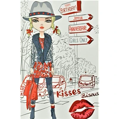 Hapy Birthday Card Red Girl Teens Young Woman Fashionable City Lips Kisses Handbag Hat Made in France