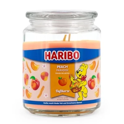 Immerse yourself in the world of sweet memories with the Haribo™ scented candle. Enjoy the irresistible fragrance that transforms your home into a haven of well-being. The large scented candle in a glass jar combines two harmonious fragrances, ensuring long-lasting, cosy hours – perfect for relaxing, gifting, or simply enjoying. Haribo™ scented candle at a glance - Dimensions H x W x D: approx. 13 x 10 x 10 cm - Weight: approx. 1.04 kg - Contents: 510 g - Burn time: approx. 100 hours - Material: paraffin wax, glass, cotton Sweet candle scent for your home - Enjoy harmonious scents in a single candle. - Experience a long-lasting fragrance with up to 100 hours of burn time. - Add stylish accents to any living space with the modern glass design. - Enjoy even burning thanks to the double wick – no tunnelling, no residue. - Give the gift of joy: the perfect gift idea for friends and family. - Create a feel-good atmosphere and enjoy relaxing moments at home. Safety information Ventilate the