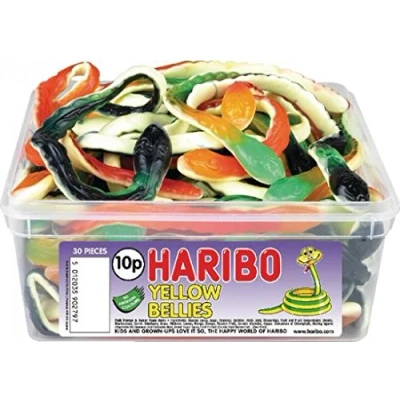 Giant Yellow Bellies sweets in a large tub Gummy on one side, foam on the other Ideal for sharing at special occasions, celebrations and more No artificial colours Store in cool, dry place Contains 30 large Jelly and foam Snakes Variety of Flavours Kids and Grown ups love it so, The Happy World of Haribo