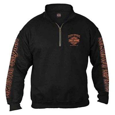 Harley-Davidson Men's Lightning Crest 1/4 Zip Pullover Cadet Sweatshirt Soft pullover, made of 50% cotton and 50% polyester Wisconsin Harley-Davidson dealer name with Bar & Shield logo on front Back features an awesome, detailed skull & eagle screen printed graphic with bold Harley-Davidson script printed down sleeves Please Note: Authentic, high-qualty, and correctly sized Harley-Davidson Clothing is only available from Harley-Davidson dealers. Please make careful note of the Sellers and Product Reviews.
