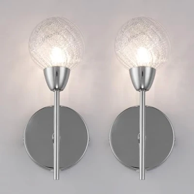 Pack of 2 Wall Lights, Polished Chrome Finish, Sphere Glass Shade, On/Off Switch Included G9 Bulb Cap Type, 33 Watts Maximum, Suitable for LED Upgrade, BULB NOT INCLUDED Overall Size for each Light: Length: 14cm (5.5 Inches), Width: 10cm (3.9 Inches), Height: 28cm (11 Inches); Diameter of Shade: 10cm (3.9 Inches) Ideal for Living Room, Bedroom, Kitchen, Office, Corridor, Hotel, B&B Packaging Includes: 2xWall Lights, 2xSphere Glass Shades, 4xScrews, 4xRawl Plugs, Installation Guide