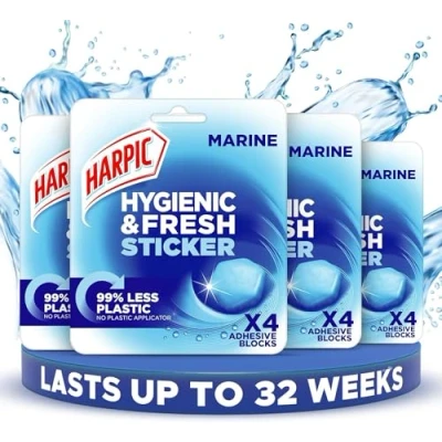 Harpic Hygienic Fresh Sticker Adhesive Toilet Block, Marine, Pack 4 x Stickers, Freshener, No Plastic Applicator, Up to 32 weeks of Freshness