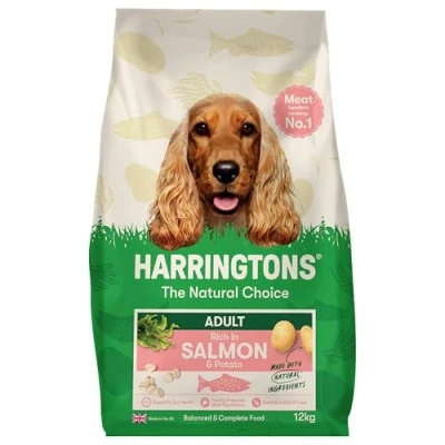 JoybuyHarringtons Adult Rich in Salmon&Potato 12kg is a premium, high-meat dry dog food featuring salmon and chicken, enriched with salmon oil, botanicals, and prebiotics for immune support, digestion, and a glossy coat. Double-coated with homemade chicken gravy, it is 100% complete, dairy-free, and made by a carbon-negative UK producer.