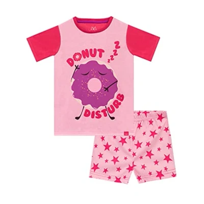 Harry Bear loves making pyjamas to hibernate in! Premium quality Kids Donut PJs A pink short sleeve top printed with a Donut motif and 'Donut Disturb' slogan. Matching pink pyjama shorts with an all-over star print Finished with lovely hand-tied Harry Bear ribbon to make the perfect gift!