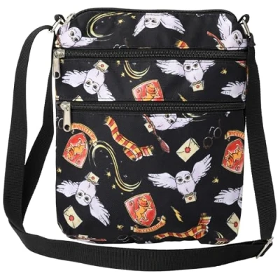 Harry Potter Crossbody Bag with Hogwarts Gryffindor all-over-print - officially licensed Main compartment has an interior zip pocket and there are two additional zipper pockets in front Measures approximately: 9" x 7" x 1.5" Shoulder strap is adjustable International products have separate terms, are sold from abroad and may differ from local products, including fit, age ratings, and language of product, labeling or instructions.