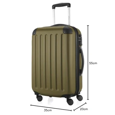 HAND LUGGAGE FOR ANY AIRLINE: At 55 x 35 x 20 cm (H x W x D), this small trolley has the most universal suitcase size for cabin luggage that fits any airline. Around 33 litre packing volume - ideal for short trips and for flying with hand luggage. Comfortable transport: the 4 rubberised easy-running castors are particularly quiet and manoeuvrable (can be rotated 360°). They offer a pleasant walking comfort on bumpy surfaces. The fully retractable telescopic rod can be locked in 3 positions (66 / 77 / 103 cm), extremely stable and ensures an upright posture. The carrying handles on the top and long sides allow for comfortable transport. Sturdy material: the matte hard shell made of 100% ABS is robust, impact-resistant and resilient. The high-quality material gives the case stability, is water-repellent and easy to clean. Thanks to the finely textured surface, the trolley is particularly resistant to wear and tear. Lightweight: with a weight of 2.3 kg, the small trolley Spree (without extension and without suitcase lock) leaves plenty of space for everything you need on the short trip as cabin luggage. A zip intermediate base and the cross tie down strap ensure order and support. More sustainability: all spare parts such as telescopic rod, handles and wheels are screwed and replaceable. For a long product life, these wear parts can be easily reordered and replaced if required.