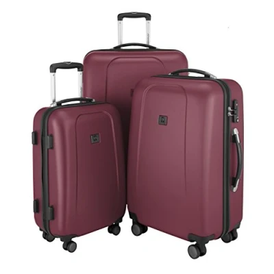 Three-piece luggage set dimensions with wheels and handels: cabin luggage 36 liter (55 x 38 x 21 cm) + suitcase 61 liter (66 x 45 x 24 cm) + suitcase 91 liter (75 x 50 x 28 cm) 100% polycarbonate + ABS-film super lightweight and stable Color: BURGUNDY