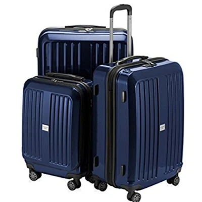 Three-piece hard-side suitcase set: 1 cabin luggage 42 liter (55 x 35 x 24 cm) + 1 suitcase 90 liter (65 x 44 x 28 cm + 6 cm) + 1 suitcase 128 liter (75 x 50 x 30 cm + 6 cm) Material: The matt surface of the suitcase is made of PC/ABS Great carrying comfort: The suitcase has 4 double wheels with an excellent driving comfort and is easy to carry. 4 wheels ensure easy and rapid movement even with heavy content. Travel safely with the TSA approval: For added security, the bag has a TSA combination lock, especially important for travel to the United States. Transport: An adjustable telescopic handle, in anodised aluminum, allows to pull the suitcase in a comfortably. The suitcase has four plastic feet on the long side and 2 handles on the top and alongside.