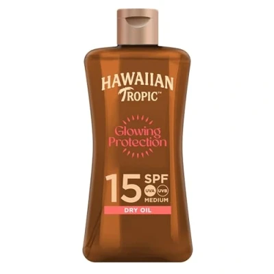 Hawaiian Tropic Glowing Protection Sunscreen Dry Oil Spray Mist, Water Resistant SPF 15 UVA + UVB Spray, Tropical Scent Sun Lotion with Coconut Oil, 100 ml Travel Size