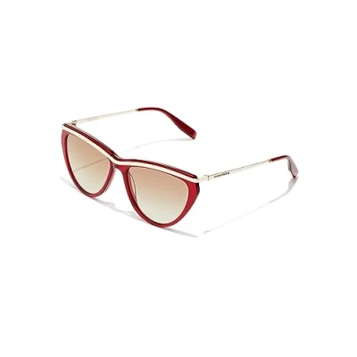 Created for those looking for a contemporary, sophisticated refresh of the classic cat eye sunglasses, This silhouette combines transparent cherry red acetate leg tips and front with a gold metal trim for the brow line that merges with the temples, It features gradient brown lenses Sunglasses category 2 filter, medium-dark colouring, suitable for average brightness outdoors, Absorb 57-81 Percent sunlight, Lens material: TR18 lenses bearing the Eastman seal, excellent optical quality and durability,Environmentally-friendly, 100 Percent UV protection, Lens Color: Brown, Lens Appearance: Cosmethic, Gradient Frame material: Metal, Acetate, Frame Color: Red, Temple Color: Gold Original Hawkers product, The box includes a microfiber cover and box Female Model. Size: Front 144 mm, Temples 145 mm, Bridge 16 mm, High 51.1 mm