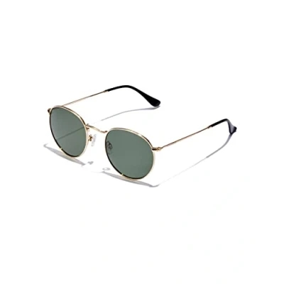 A round, metallic model with polarized, dark green lenses, The gold stainless steel frame has stippled detailing along the rims and bridge, and the slender temples are complemented by polished black ear tips Polarized sunglasses: Reduces surface reflections and eye fatigue, providing superior sharpness and contrast, Sunglasses category 3 filter, dark colouring, suitable for full sun outdoors, Absorb 82-92 Percent sunlight, Lens material: Lenses made of polarised bio tac material, 100 Percent UV protection, Lens Color: Green, Lens Appearance: Solid Frame material: Metal, Frame Color: Gold, Temple Color: Gold Original Hawkers product, The box includes a microfiber cover and box Unisex Model. Size: Front 132.5 mm, Temples 145 mm, Bridge 22 mm, High 47.5 mm