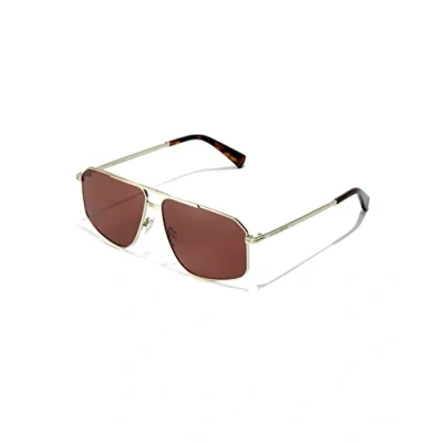 The variety of details, engravings, and lines at the bridge level are the essence of this unisex model, Design with a stylized gold stainless-steel frame and striking features in an angular shape with rosewood lenses Sunglasses category 3 filter, dark colouring, suitable for full sun outdoors, Absorb 82-92 Percent sunlight, Lens material: TR18 lenses bearing the Eastman seal, excellent optical quality and durability,Environmentally-friendly, 100 Percent UV protection, Lens Color: Brown, Lens Appearance: Solid Frame material: Metal, Frame Color: Gold, Temple Color: Gold Original Hawkers product, The box includes a microfiber cover and box Male Model. Size: Front 145 mm, Temples 145 mm, Bridge 13 mm, High 47.2 mm