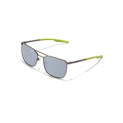 A "gun metal" design with a double bridge, square-shaped mirrored chrome Polarized sunglasseses and grape green rubber temple tips, which add a sporty twist to a sophisticated design as well as improving grip Polarized sunglasses: Reduces surface reflections and eye fatigue, providing superior sharpness and contrast, Sunglasses category 3 filter, dark colouring, suitable for full sun outdoors, Absorb 82-92 Percent sunlight, Lens material: Lenses made of polarised bio tac material, 100 Percent UV protection, Lens Color: Silver, Lens Appearance: Mirror Frame material: Metal, Frame Color: Grey, Temple Color: Grey, Green Original Hawkers product, The box includes a microfiber cover and box Unisex Model. Size: Front 141 mm, Temples 135 mm, Bridge 17 mm, High 46 mm