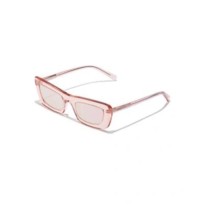 A slim chic rectangular design with a touch of cat eye, This polished transparent pink model combines a broad-rimmed frame front with mirrored rose gold lenses, The slender temples with visible metallic internal rod sylize and soften the silhouette Sunglasses category 3 filter, dark colouring, suitable for full sun outdoors, Absorb 82-92 Percent sunlight, Lens material: TR18 lenses bearing the Eastman seal, excellent optical quality and durability,Environmentally-friendly, 100 Percent UV protection, Lens Color: Rosegold, Lens Appearance: Solid Frame material: Acetate, Frame Color: Pink, Temple Color: Pink Original Hawkers product, The box includes a microfiber cover and box Female Model. Size: Front 143.5 mm, Temples 140 mm, Bridge 20 mm, High 40 mm