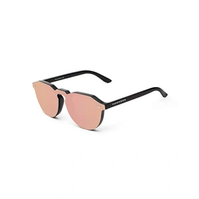 Shiny black frame and rose gold mirror mask len Sunglasses category 3 filter, dark colouring, suitable for full sun outdoors, Absorb 82-92 Percent sunlight, Lens material: Premium nylon lens, ideal for sports and performance frames due to its great strengthand light weight, 100 Percent UV protection, Lens Color: Rosegold, Lens Appearance: Mirror Frame material: TR90, Frame Color: Black, Temple Color: Black Original Hawkers product, The box includes a microfiber cover and box Female Model. Size: Front 141 mm, Temples 140 mm, Bridge 21 mm, High 50.3 mm