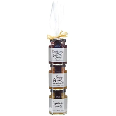 PERFECT SWEET GIFT: A delightful selection of three classic sweet treats, GIFT WRAPPED in CLEAR WRAP and a decorative TIE. Ideal for BREAKFAST, baking, or a housewarming present. QUALITY & PROVENANCE: Proudly HAND-MADE IN THE UK in the LAKE DISTRICT. A gourmet selection from the award-winning Hawkshead Relish Company. RASPBERRY & VANILLA JAM: Our ALL-TIME BESTSELLER! Packed with raspberries and a delicious hint of VANILLA. Perfect in a VICTORIA SPONGE, on toast, or with scones. (130g jar) FIVE FRUIT MARMALADE: A vibrant, zesty marmalade containing your FIVE-A-DAY with Oranges, Lemons, Limes, Kumquat, and Grapefruit. So very fruity with lots of peel. (130g jar) FIVE FRUIT MARMALADE: A vibrant, zesty marmalade containing your FIVE-A-DAY with Oranges, Lemons, Limes, Kumquat, and Grapefruit. So very fruity with lots of peel. (130g jar)