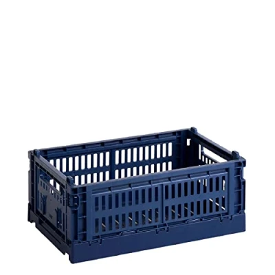 Very nice storage or transport box from the Hay brand from the Colour Crate collection The box is made from 100% recycled post-consumer plastic waste in the colour dark blue The multifunctional box is suitable for storing and organising various items on shelves, tables or in cupboards Available in various colours and sizes and stackable in different size combinations Dimensions: 26.5 cm x 17 cm x 10.5 cm