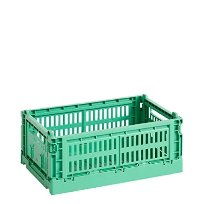 Very nice storage or transport box from the Hay brand from the Colour Crate collection The box is made from 100% recycled post-consumer plastic waste in the colour dark mint The multifunctional box is suitable for storing and organising various items on shelves, tables or in cupboards Available in various colours and sizes and stackable in different size combinations Dimensions: 26.5 cm x 17 cm x 10.5 cm