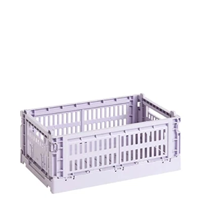 Very beautiful storage or transport box from HAY from the Colour Crate collection The box is made from 100% recycled post-consumer plastic waste in the colour lavender The multifunctional box is suitable for storing and organising various items on shelves, tables or in cupboards Available in different colours and sizes and stackable on top of each other in different size combinations Dimensions: 26.5 cm x 17 cm x 10.5 cm