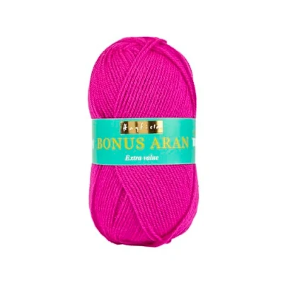 The ever-popular, extra value 100% acrylic yarn Hayfield Bonus knitting yarn in an Aran weight. Bonus Aran offers the same beautiful stitch definition and great value that makes Bonus double knitting such a family favourite. Trust Hayfield Bonus for versatile, reliable, affordable quality yarn in the most up to date colours for knit and crochet, from soft pastels to vibrant neons. Astonishingly soft and smooth for a great value acrylic, with clear stitch definition, Bonus Aran is a joy to work with. 100% acrylic. Machine washable at 40 degrees/ wool cycle. Do not bleach, do not iron.