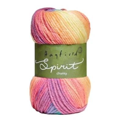 The chunky version of popular Spirit DK, Hayfield Spirit Chunky by Sirdar brings you the same self-striping, beautiful wool blended yarn in an easy to use Chunky weight that creates quick, colourful knits with minimum effort. Hayfield Spirit is a colour effect yarn available in DK and Chunky weights, and a wide variety of beautiful shades. This easy-wear, easy care yarn is a favourite variegated yarn ideal for Autumnal jumpers, sweaters and accessories for all the family. 80% Acrylic 20% Wool. 100% acrylic. Machine washable at 40 degrees/ wool cycle. Do not bleach, do not iron.