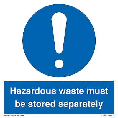 M001 : General mandatory action This sign is made from vinyl high tack A stickier sticker. Uses a stronger adhesive to make it more suitable for plastic surfaces like Wheelie Bins or where the sticker might get rubbed. S15 square Sign Text: Hazardous waste must be stored separately
